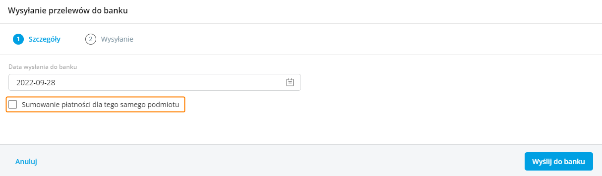 Po wybraniu przycisku Wyślij przelew pojawi się okno, na którym należy wskazać datę wysyłki. Na oknie znajduje się także parametr Sumowanie płatności dla tego samego podmiotu. Jeżeli parametr zostanie zaznaczony to w przypadku przelewów zwykłych oraz do Urzędu Skarbowego przelewy dla tego samego kontrahenta/Urzędu Skarbowego będą grupowane w jeden.