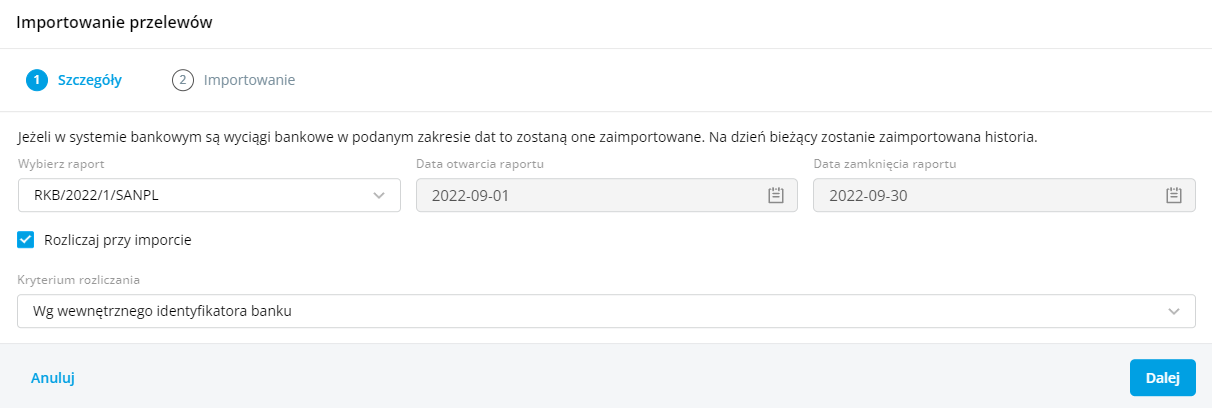 Po wybraniu przycisku Przejdź do importu pojawi się okno, na którym wybieramy raport bankowy: