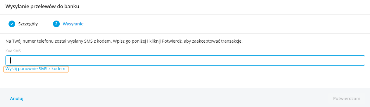Akceptacja przelewów za pomocą kodu SMS wymaga podania kodu SMS, który zostanie wysłany na numer telefonu Użytkownika. W przypadku podania błędnego kodu SMS lub w sytuacji, gdy kod SMS wygasł mamy możliwość wysłania prośby o przesłanie nowego kodu SMS.