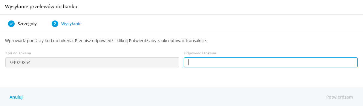 Wysyłkę uruchamiamy za pomocą opcji Wyślij do banku. Na następnym oknie możemy wybrać metodę akceptacji dla przelewów. Do wyboru jest akceptacja za pomocą kodu SMS, tokena, podpisu kwalifikowanego. Można też skorzystać z opcji bez akceptacji, aby zatwierdzić przelewy bezpośrednio w systemie bankowym. Po wybraniu przycisku Anuluj wysyłanie przelewów zostanie przerwane.