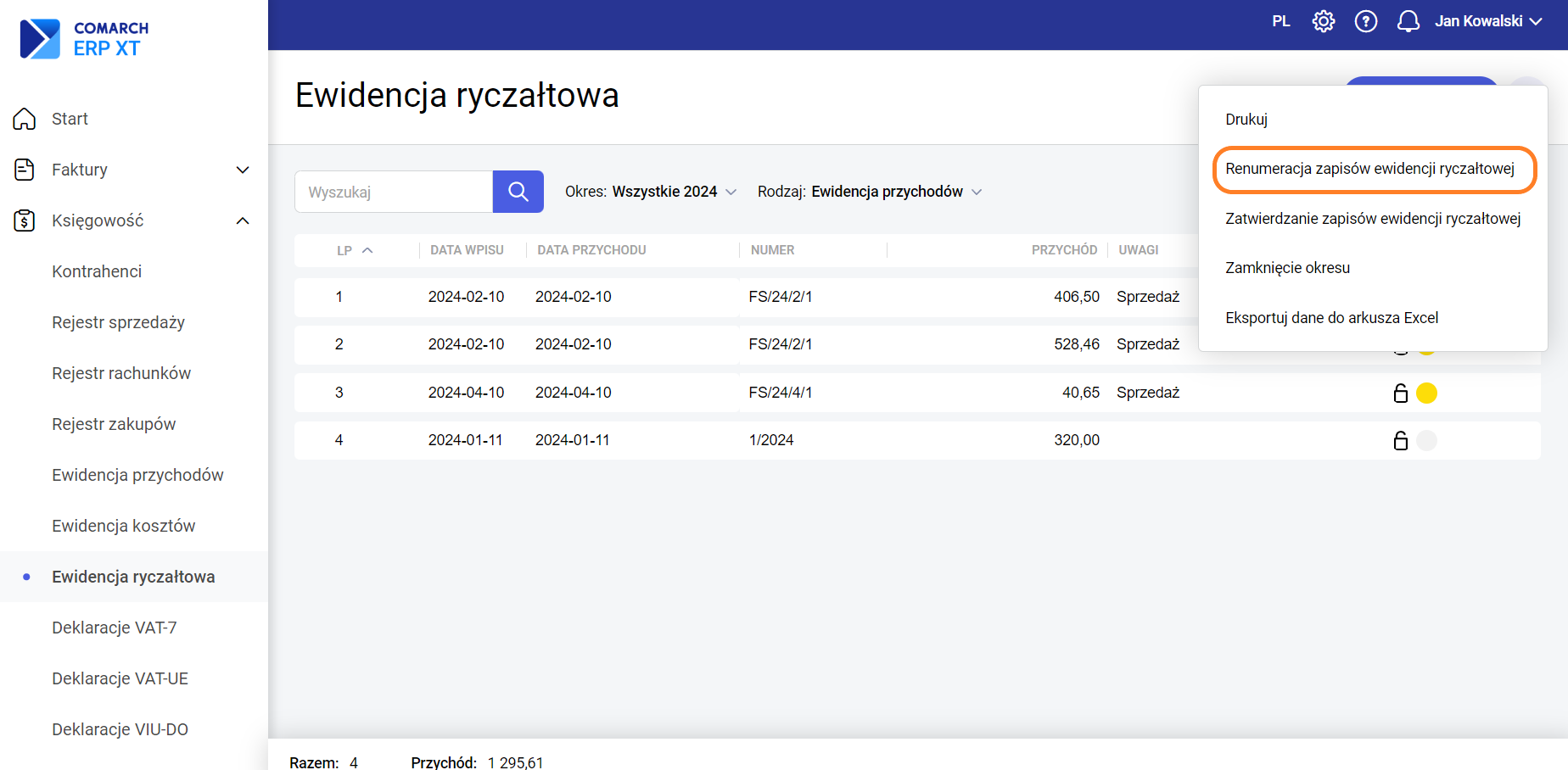 Funkcja „Renumeracja zapisów ewidencji ryczałtowej” dostępna jest z poziomu Księgowość – Ewidencja ryczałtowa w menu pod trzema kropkami.