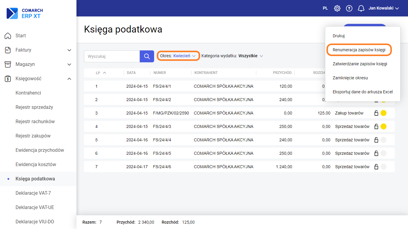 Funkcja ta dostępna jest z poziomu Księgowość >>> Księga podatkowa >>> … >>> Renumeracja zapisów księgi.
