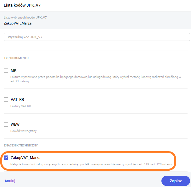 Dokumenty zakupu towarów, które będziemy odsprzedawać w procedurze marża, podlegają oznaczeniu kodem JPK_V7: „ZakupVAT_Marza”.