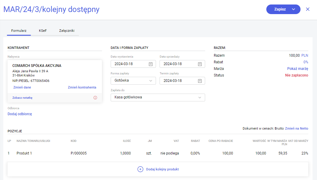 Zarówno na dokumencie, karcie produktu jak i kontrahenta istnieje możliwość przypisania kodu JPK_V7: „ZakupVAT_Marza”: