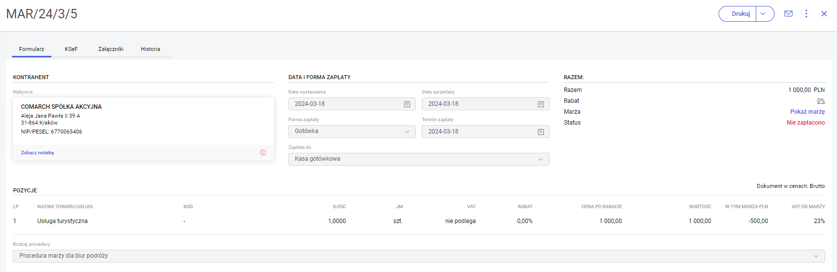 1. Na fakturze VAT marża pozycja w stawce VAT nie podlega, kwota marży w wysokości -500, VAT od marży: 23%: