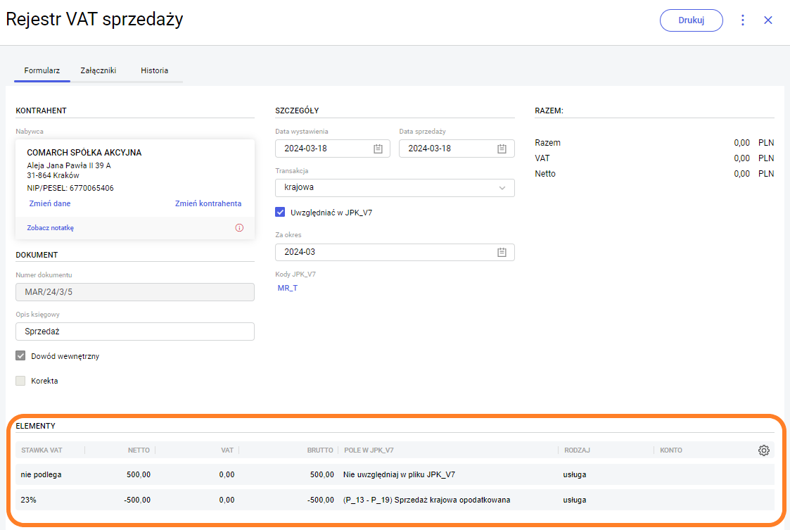 2. Na dokumencie rozliczenia marży w rejestrze VAT sprzedaży powstaną dwie pozycje: