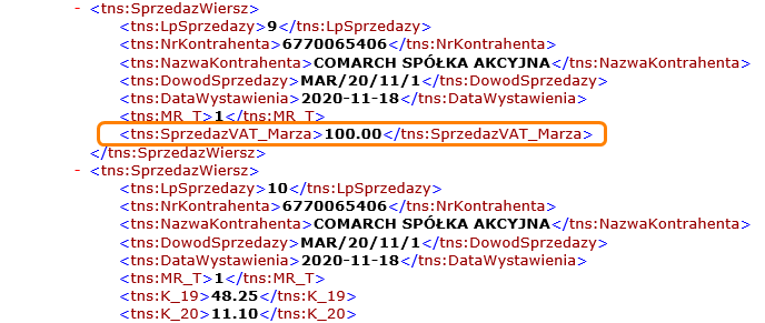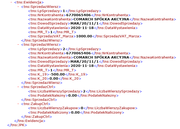 3. Podczas wyliczania pliku JPK_V7 dokument rozliczenia marży z zerową kwotą VAT i kwotą brutto na minus w stawce opodatkowanej nie jest uwzględniany w części deklaracyjnej. Faktura VAT marża z ujemną kwotą marży oraz dokument rozliczenia marży jest wykazywany w części ewidencyjnej pliku JPK_V7: