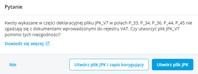 Podczas tworzenia pliku JPK_V7 program weryfikuje czy kwota wprowadzona w polu 33, 34, 36 oraz 44, 45 w części deklaracyjnej pliku JPK_V7 jest zgodna z dokumentami wprowadzonymi do rejestru VAT. W przypadku występowania różnic, podczas tworzenia pliku JPK_V7 pojawi się komunikat: