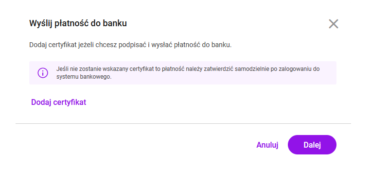 Wybór przycisku: Wyślij spowoduje wyeksportowanie przelewów do systemu bankowego. Po wybraniu przycisku: Anuluj operacja eksportu przelewów zostanie przerwana, okno eksportu zostanie zamknięte. Przycisk: Wybierz certyfikat przenosi widok Użytkownika na poprzednie okno konfiguracji eksportu.