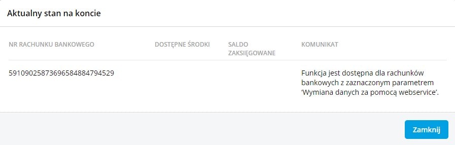 Dla rachunków bankowych, które nie mają skonfigurowanej wymiany danych za pomocą webservice podczas odczytywania bieżącego salda na rachunku pojawi się komunikat: