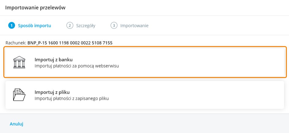 Po wybraniu przycisku Przejdź do importu pojawi się okno z wyborem sposobu importu. W celu zaimportowania przelewów z banku za pomocą usługi webservice należy wybrać opcję Importuj z banku. Po wybraniu przycisku Anuluj operacja importu zostanie przerwana.