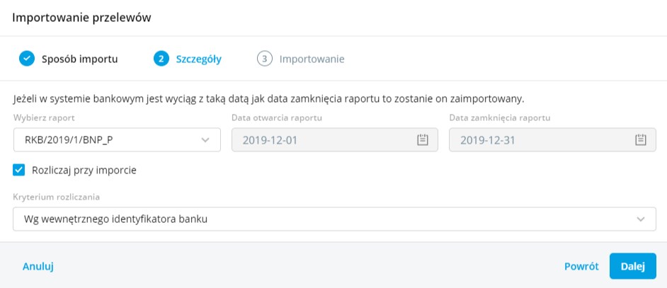 Po wybraniu opcji Importuj z banku pojawi się okno, na którym wybieramy raport bankowy.