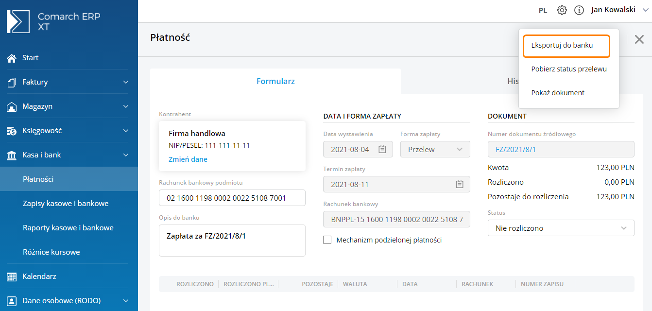 Eksport przelewów jest dostępny z poziomu formularza płatności, która jest płatnością rozchodową, a także jest zatwierdzona i nierozliczona bądź rozliczona częściowo. Aby wyeksportować taką płatność należy w menu kontekstowym wybrać Eksportuj do banku.