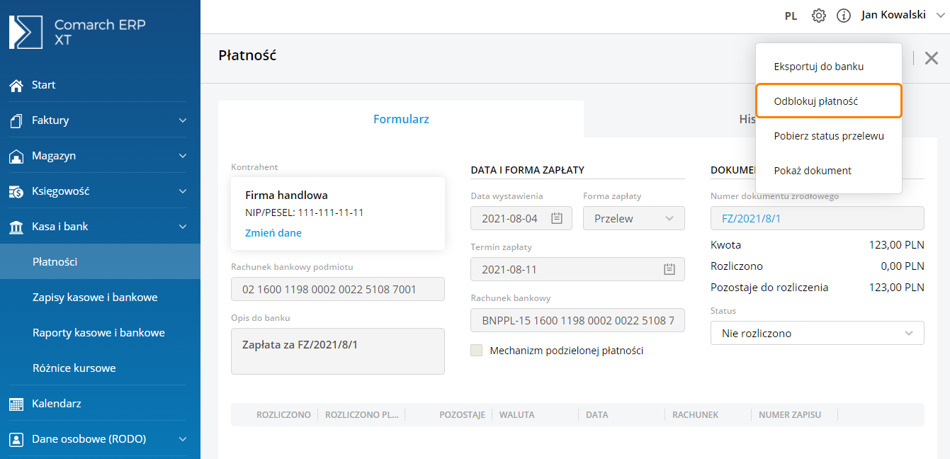 Wyeksportowane przelewy są zaznaczone na liście niebieską kropką, takie przelewy są zablokowane do edycji, jednak można je odblokować wybierając opcję Odblokuj płatność w menu kontekstowym. Po odblokowaniu nie będzie możliwości ponownego eksportu przelewów do banku za pomocą webservice.