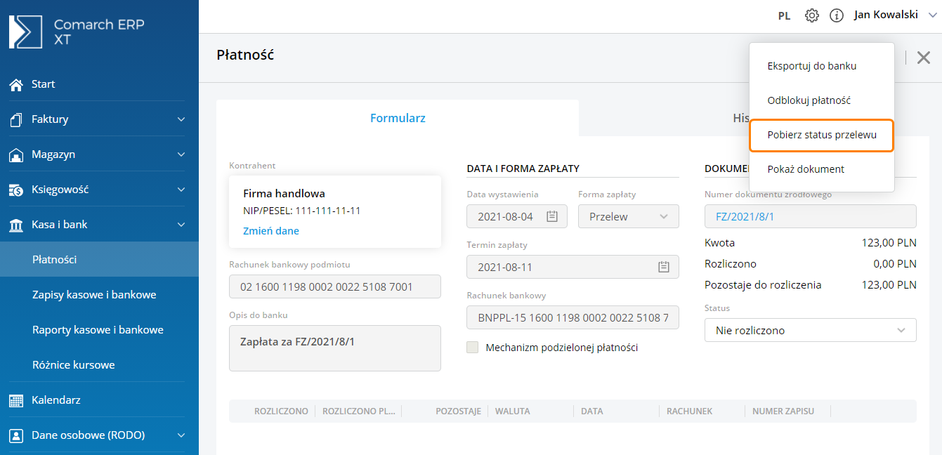 Opcja jest również dostępna z poziomu formularza płatności w menu kontekstowym jako Pobierz status przelewu.