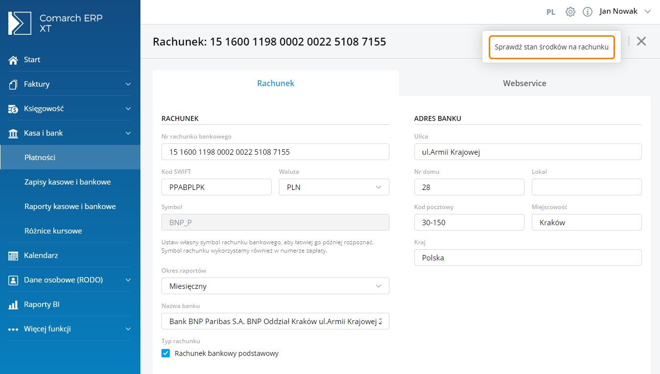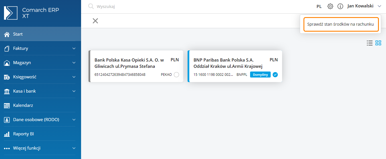Odczytanie bieżącego salda na rachunku bankowym możliwe jest z poziomu listy rachunków bankowych oraz z formularza rachunku.