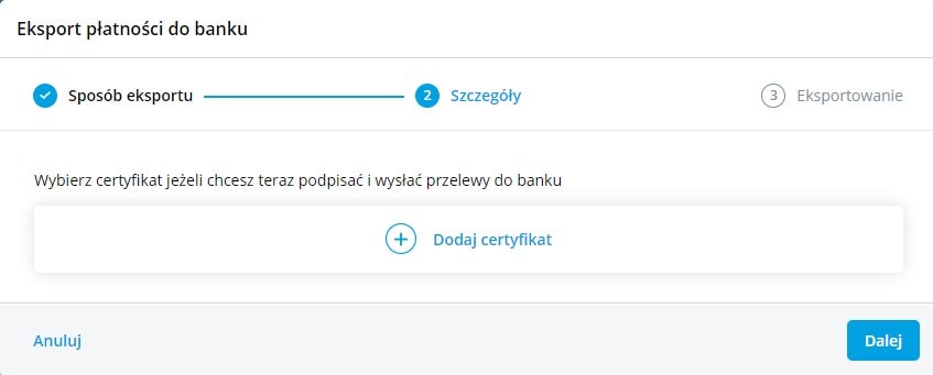 Po wskazaniu opcji Eksportuj do banku pojawi się okno, na którym Użytkownik może wskazać certyfikat autoryzacyjny (podpis elektroniczny), którym zostaną podpisane przelewy wysyłane do banku.