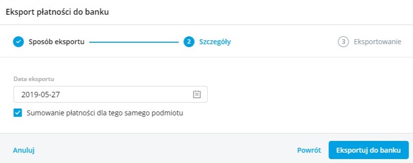 Po wybraniu przycisku Dalej pojawi się okno, na którym należy wskazać datę eksportu. Na oknie znajduje się także parametr Sumowanie płatności dla tego samego podmiotu. Jeżeli parametr zostanie zaznaczony to w przypadku przelewów zwykłych oraz do Urzędu Skarbowego przelewy dla tego samego kontrahenta/Urzędu Skarbowego będą grupowane w jeden.