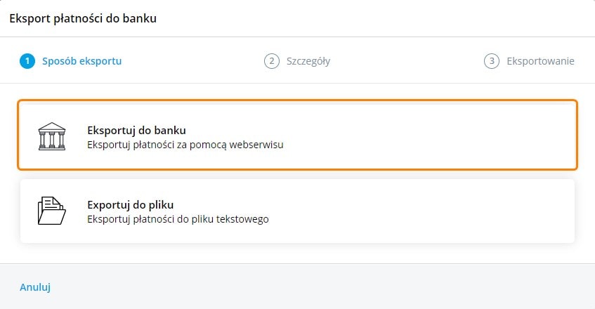 Wybór przycisku Eksportuj do banku spowoduje wyeksportowanie przelewów do systemu bankowego. Po wybraniu przycisku Anuluj operacja eksportu przelewów zostanie przerwana, okno eksportu zostanie zamknięte. Przycisk Powrót przenosi widok Użytkownika na poprzednie okno konfiguracji eksportu.