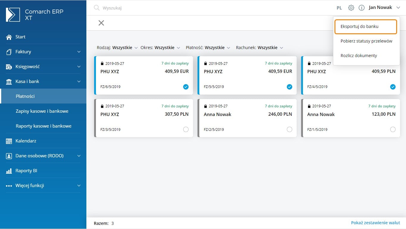 Uwaga! Zaleca się aby okres raportów kasowych/bankowych w systemie Comarch Betterfly był taki sam jak okres raportów w systemie bankowym.