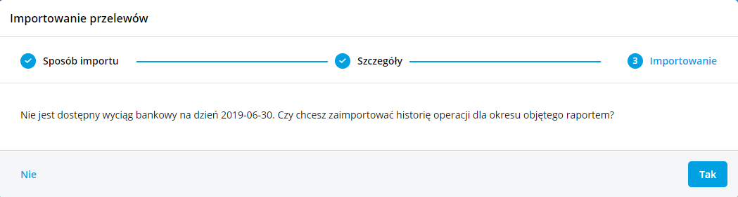 Po wybraniu opcji „Tak” przelewy – za okres od daty otwarcia do daty zamknięcia raportu – zostaną zaczytane z systemu bankowego. Po wybraniu opcji „Nie” import historii operacji zostanie przerwany.