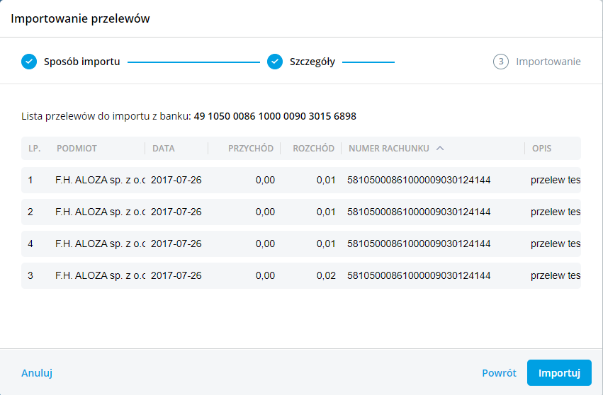 Wybór przycisku Importuj powoduje zapisanie przelewów na liście zapisów kasowych/bankowych. Aby przelewy zaimportowały się poprawnie, w programie musi być otwarty raport bankowy na dzień przelewu. Dodatkowo program sprawdza czy taki przelew nie został już wcześniej zaimportowany. Po wybraniu przycisku Anuluj operacja importu przelewów zostanie przerwana, a okno importu zostanie zamknięte. Przycisk Powrót przenosi widok Użytkownika na poprzednie okno konfiguracji importu.