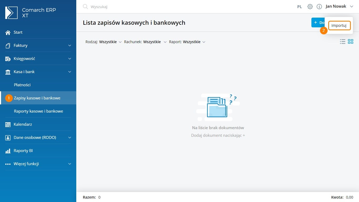 Opcja importu jest dostępna na liście zapisów kasowych/bankowych w menu kontekstowym: