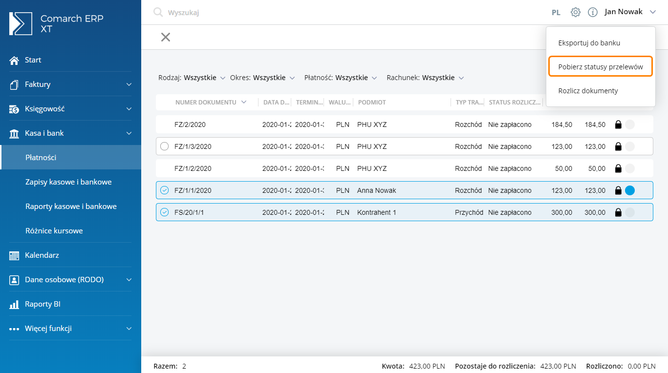 Możliwe jest również pobieranie dla każdego wysłanego przelewu jego aktualnego statusu w banku (przelew może oczekiwać na realizację, zostać zrealizowany, odrzucony, anulowany itp.).