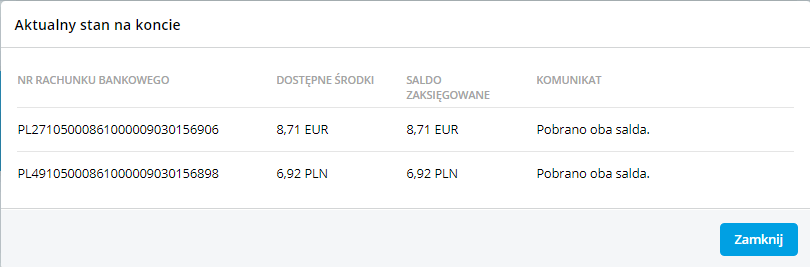 Odczytywanie bieżącego salda na rachunku bankowym jest możliwe z poziomu formularza rachunku bankowego. W menu kontekstowym należy wybrać opcję Sprawdź stan środków na rachunku. Po pobraniu sald zostanie wyświetlone okno o tytule Aktualny stan na koncie.