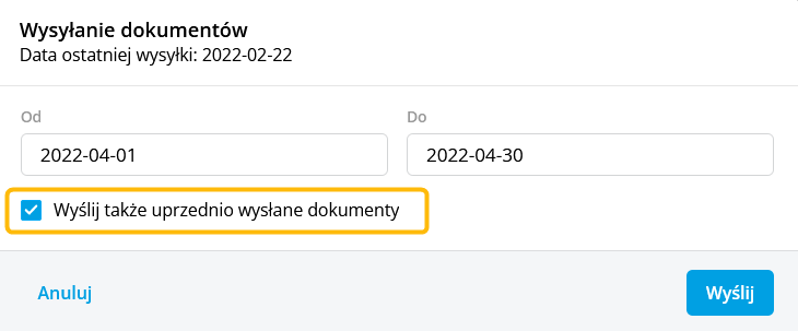 Po zaznaczeniu parametru, w paczce znajdują się dokumenty z danego okresu, również te, które zostały wcześniej wyeksportowane, a także dane słownikowe. Dokument, który został wyeksportowany oznaczony jest na liście niebieską kropką a w widoku kafelków adnotacją Wysłano do księgowego.