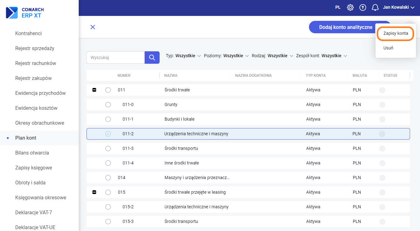 Dodatkowo została dodana możliwość wyświetlenia zapisów konta z poziomu Planu kont oraz Zestawienia obrotów i sald. Po zaznaczeniu konkretnego konta księgowego w menu kontekstowym jest widoczna opcja Zapisy konta. Po jej wybraniu zostaniemy przeniesieni na Zakładkę Konto z odpowiednim ustawieniem w filtrach.