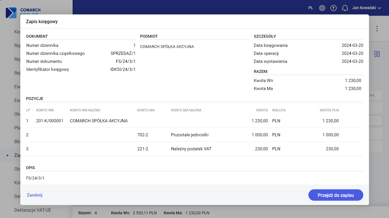 Po kliknięciu na konkretny zapis pokaże nam się formularz w trybie do odczytu. Po kliknięciu w przycisk „Przejdź do zapisu” zostaniemy przeniesieni na zapis księgowy z możliwością jego modyfikacji.