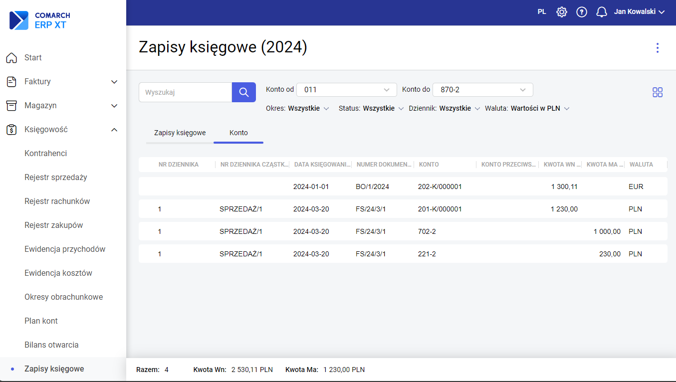 Domyślnie po wejściu na zakładkę Konto będą pokazywały się zapisy na wszystkich kontach księgowych oraz zapisy dotyczące Bilansu otwarcia. Na dole ekranu będzie widoczne podsumowanie zawierające Kwotę Wn oraz Kwotę Ma. Jeśli mamy jakieś zapisy w walutach obcych, to ich wartość będzie pokazywana w przeliczeniu na PLN.