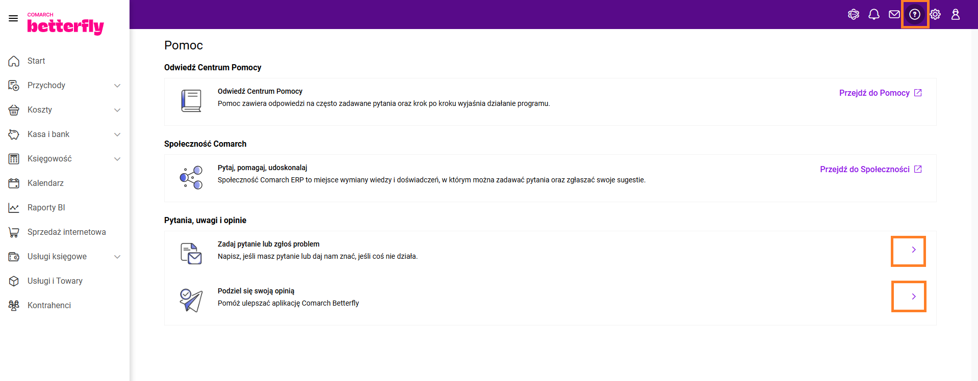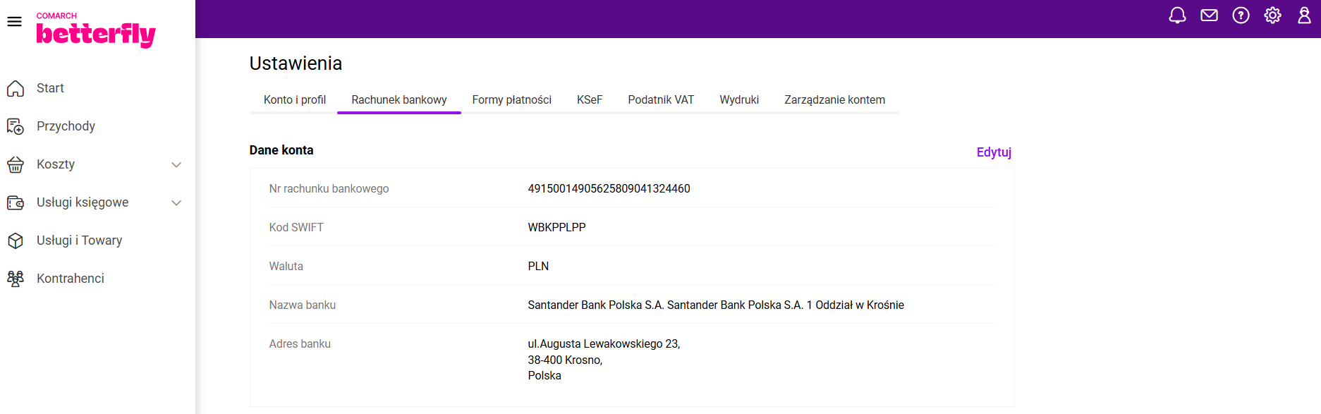 niedziela i święta: nieczynne Na infolinii dla obecnych użytkowników eFaktury Plus konieczne jest podanie ID i PIN, które można znaleźć w menu Ustawienia - Dane profilowe, w sekcji: Dane klienta Comarch. Aby włączyć tą opcję biuro rachunkowe musi mieć zainstalowany system Comarch ERP Optima w wersji 2025.0 lub wyższej. W aplikacjach mobilnych formy płatności dostępne są w menu Ustawienia/ Formy płatności. Aby zmienić domyślny termin płatności należy edytować wybraną pozycję ikoną ołówka, a następnie podać odpowiednią liczbę dni i zapisać. Zarejestrowane konto w aplikacji Comarch Betterfly moduł eFaktury jest częścią rozwiązań chmurowych Comarch Cloud. Zmiana hasła jest możliwa: Aby to wykonać zmianę hasła z poziomu portalu Comarch Cloud, kliknij tutaj. Następnie wybierz opcję "Zaloguj się" i "Nie pamiętasz hasła?". W kolejnym kroku wpisz adres e-mail, na który zostało założone konto w Comarch Betterfly moduł eFaktury i postępuj zgodnie z instrukcjami wyświetlanymi na ekranie. W aplikacjach mobilnych rachunek bankowy jest dostępny w menu Ustawienia/ Rachunki bankowe. Dane Twojej firmy dostępne są w menu Ustawienia/ Konto i profil, a w aplikacjach mobilnych w menu Ustawienia/ Moje dane. Informacje o koncie zawierają takie dane firmy jak: numer NIP, nazwa firmy, dane teleadresowe. Jeśli chcesz dokonać zmiany w swoich danych, wystarczy kliknąć w opcję: Edytuj. Wówczas wybrane pola będą dostępne do aktualizacji.Twoje konto Comarch ERP XT Start zostało przeniesione do nowego systemu Comarch Betterfly
