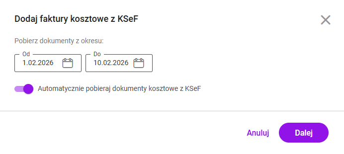 - Jeśli jest to pierwszy import z KSeF: domyślnie ustawiony zostanie zakres od pierwszego dnia bieżącego miesiąca do daty bieżącej
