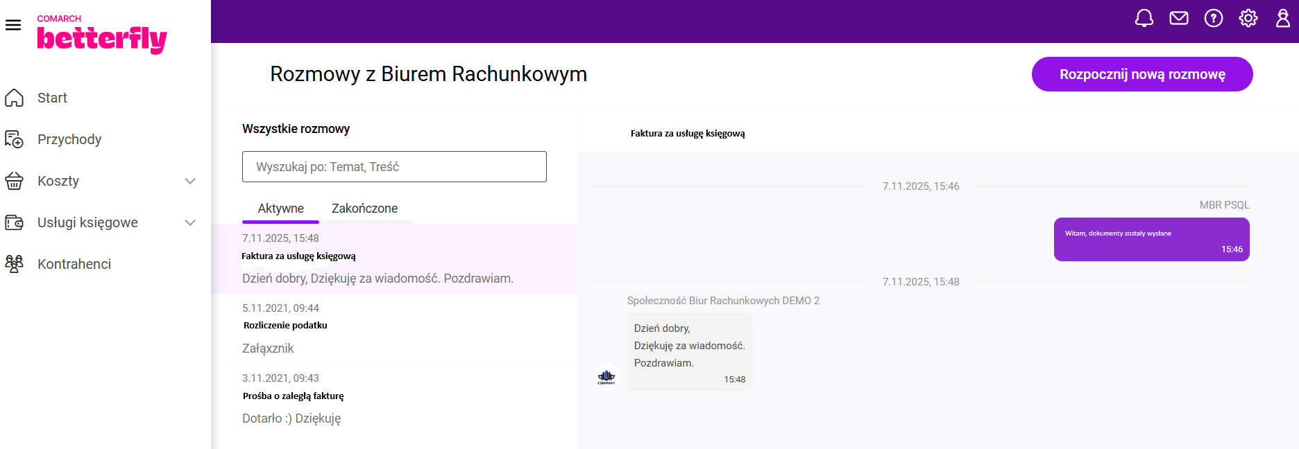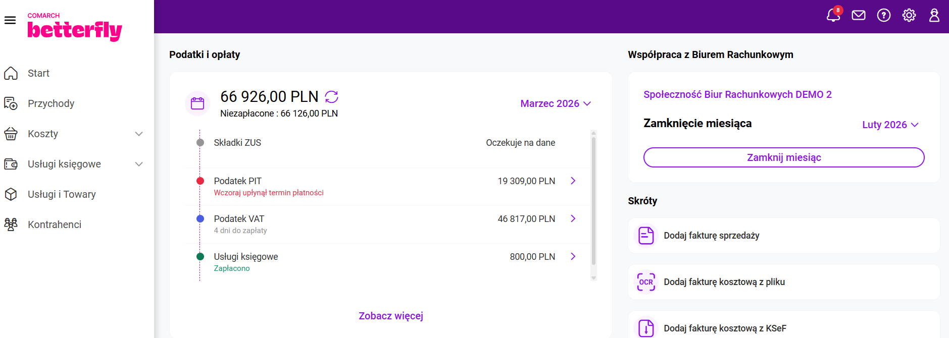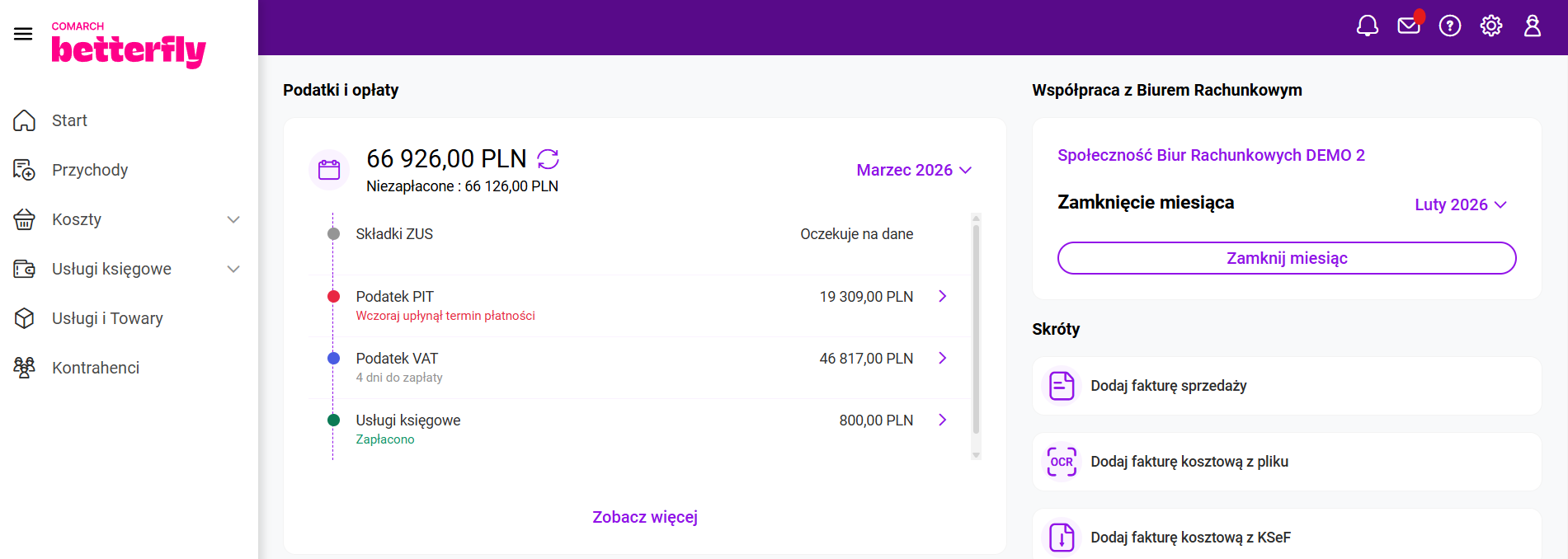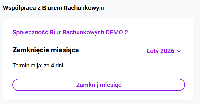 Zakres informacji obejmuje adres strony internetowej, adres e-mail oraz telefon kontaktowy. W przypadku aplikacji mobilnej z tego poziomu można od razu zadzwonić do Biura Rachunkowego lub wysłać wiadomość e-mail poprzez własną aplikację pocztową zainstalowaną na urządzeniu. W aplikacji Comarch Betterfly moduł eFaktury po uruchomieniu wymiany danych z Biurem Rachunkowym, na pulpicie startowym wyświetla się sekcja: Podatki i opłaty. Biuro Rachunkowe, po wyliczeniu odpowiednich zobowiązań Klienta, przesyła te informacje w ramach wymiany danych. Informacja o składkach ZUS Biuro Rachunkowe, z którym została nawiązana współpraca ma możliwość udostępnienia Klientom Comarch Betterfly moduł eFaktury informacji o podatkach i opłatach oraz wydruków, na podstawie których zostały wyliczone zobowiązania. Na menu głównym Usługi księgowe/ Wydruki od księgowego po odebraniu danych od Księgowego, będą dostępne wydruki dotyczące zaliczek i deklaracji, zapisów księgowych oraz rejestrów VAT. Kliknięcie w wydruk otworzy podgląd wydruku. Z tego poziomu będzie możliwe pobranie lub wydrukowanie dokumentu. Po zaznaczeniu na liście jednego, bądź kilku wydruków jest dostępna opcja Pobierz. Po jej kliknięciu zostanie pobrany plik .pdf zawierający wydruk (jeśli zaznaczony był jeden wydruk) lub plik w formacie .zip zawierający kilka wydruków (jeśli na liście zostało zaznaczonych kilka wydruków). Proces zamykania miesiąca pozwala Klientowi Biura Rachunkowego potwierdzić, że wprowadził i przekazał wszystkie wymagane dokumenty za dany miesiąc. Umożliwia to Księgowemu rozpoczęcie prac związanych z zamknięciem księgowym miesiąca i przygotowaniem deklaracji podatkowych. Zamknięcie miesiąca jest możliwe, gdy Użytkownik korzysta z Internetowej Wymiany Dokumentów. Miesiąc może być zamknięty: Funkcja Zamknięcie miesiąca może być stosowana przez Biuro Rachunkowe w dwóch trybach: Obsługa zamknięcia miesiąca Zamknięcie miesiąca przez Użytkownika jest możliwe za pomocą przycisku Zamknij miesiąc, który znajduje się na Pulpicie w sekcji z wizytówką Biura Rachunkowego. Widok sekcji Zamknięcie miesiąca gdy Biuro Rachunkowe nie przesłało terminu na zamykanie miesięcy. Widok sekcji Zamknięcie miesiąca gdy Biuro Rachunkowe przesłało termin na zamykanie miesięcy. Po kliknięciu przycisku Zamknij miesiąc pojawi się okno z komunikatem potwierdzającym chęć zamknięcia miesiąca. Gdy Użytkownik zdecyduje się zamknąć dany miesiąc program Comarch Betterfly moduł eFaktury dokona weryfikacji dokumentów. Sposób weryfikacji dokumentów będzie zależał to tego czy jest skonfigurowana integracja z Krajowym Systemem e-Faktur (KSeF). Gdy KSeF nie jest skonfigurowany program Comarch Betterfly moduł eFaktury dokona sprawdzenia czy w module Faktury znajdują się niezatwierdzone dokumenty jak poniżej: W sytuacji gdy występują dokumenty w buforze pojawi się okno z komunikatem: Po naciśnięciu przycisku Tak dokumenty zostaną automatycznie zatwierdzone. Po zatwierdzeniu dokumentów w buforze nastąpi automatyczne wysłanie dokumentów do Biura Rachunkowego przez IWD a miesiąc zostanie zamknięty. W sytuacji gdy KSeF jest skonfigurowany program Comarch Betterfly moduł eFaktury dokona dodatkowo sprawdzenia czy na liście Faktur sprzedaży znajdują się faktury, które nie zostały wysłane do KSeF. Wysłanie zaległych faktur do KSeF Użytkownik musi wykonać ręcznie. Zatwierdzenie pozostałych dokumentów, jeżeli są w buforze, może być wykonane automatycznie. Jeżeli Księgowy przesłał termin na zamykanie miesięcy i upłynie termin na zamknięcie konkretnego miesiąca: Użytkownik będzie mógł usunąć dokumenty w buforze bez potrzeby otwierania miesiąca przez Księgowego. W zamkniętym miesiącu Użytkownik nie ma możliwości dodawania nowych dokumentów ani modyfikowania niezatwierdzonych jeżeli zapis spowodowałby dodanie dokumentu do zamkniętego miesiąca. Blokada dotyczy dokumentów i wybranych na nich dat jak poniżej: Gdy na dokumencie Użytkownik wskaże datę wystawienia (dla dokumentów sprzedażowych) lub datę wpływu (dla dokumentów kosztowych), która zawiera się w zamkniętym okresie pojawi się komunikat informujący o zamknięciu miesiąca. Gdy dany miesiąc został zamknięty wysyłka dokumentów za dany okres do Biura Rachunkowego przez IWD nie jest możliwa. Jeżeli zakres dat, wybrany na oknie Dodatkowa wymiana danych, obejmuje, nawet częściowo, przynajmniej jeden zamknięty miesiąc zostanie wyświetlona informacja jak poniżej: Zamknięty miesiąc może otworzyć tylko Księgowy. W związku z tym aby otworzyć zamknięty miesiąc należy skontaktować się z Księgowym. Można wykorzystać w tym celu panel wiadomości. Więcej informacji na ten temat znajduje się w artykule: Gdzie można wysłać wiadomość do Biura Rachunkowego? Po przesłaniu przez Biuro Rachunkowe przez IWD informacji o otwarciu miesiąca dany miesiąc zostanie otwarty, w Centrum powiadomień pojawi się informacja o tym fakcie, a na Pulpicie w sekcji „Zamknięcie miesiąca” będzie aktywny przycisk Zamknij miesiąc. W Centrum powiadomień Użytkownik może znaleźć poniższe informacje o zamknięciu miesiąca. Przypisanie kategorii sprzedaży/zakupu do kontrahenta przyspiesza opisywanie dokumentów dla Biura rachunkowego, ponieważ jest ona automatycznie przenoszona na wprowadzane dokumenty. Użytkownik ma możliwość seryjnego przypisywania kategorii sprzedaży oraz zakupu dla wielu kontrahentów jednocześnie. Na liście Kontrahenci, po zaznaczeniu jednego lub więcej kontrahentów, w menu kontekstowym dostępne są opcje Zmień kategorię sprzedaży oraz Zmień kategorię zakupu. Wybierając opcję Zmień kategorię sprzedaży, Użytkownik może przypisać nową kategorię sprzedaży dla wybranych kontrahentów. Analogicznie, opcja Zmień kategorię zakupu umożliwia przypisanie nowej kategorii zaku