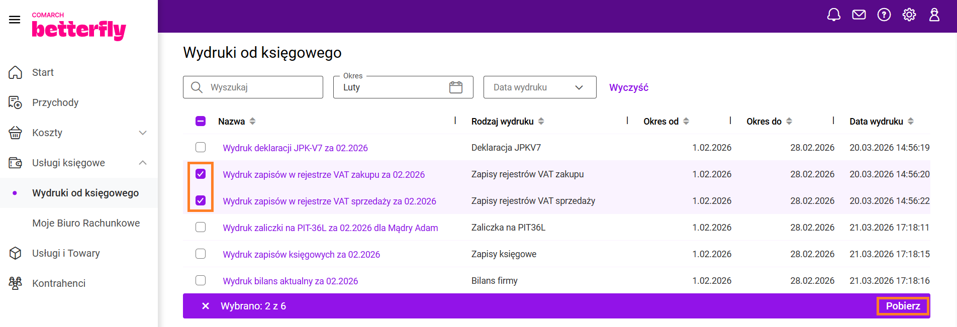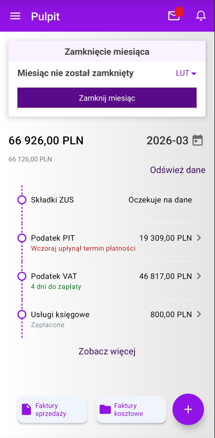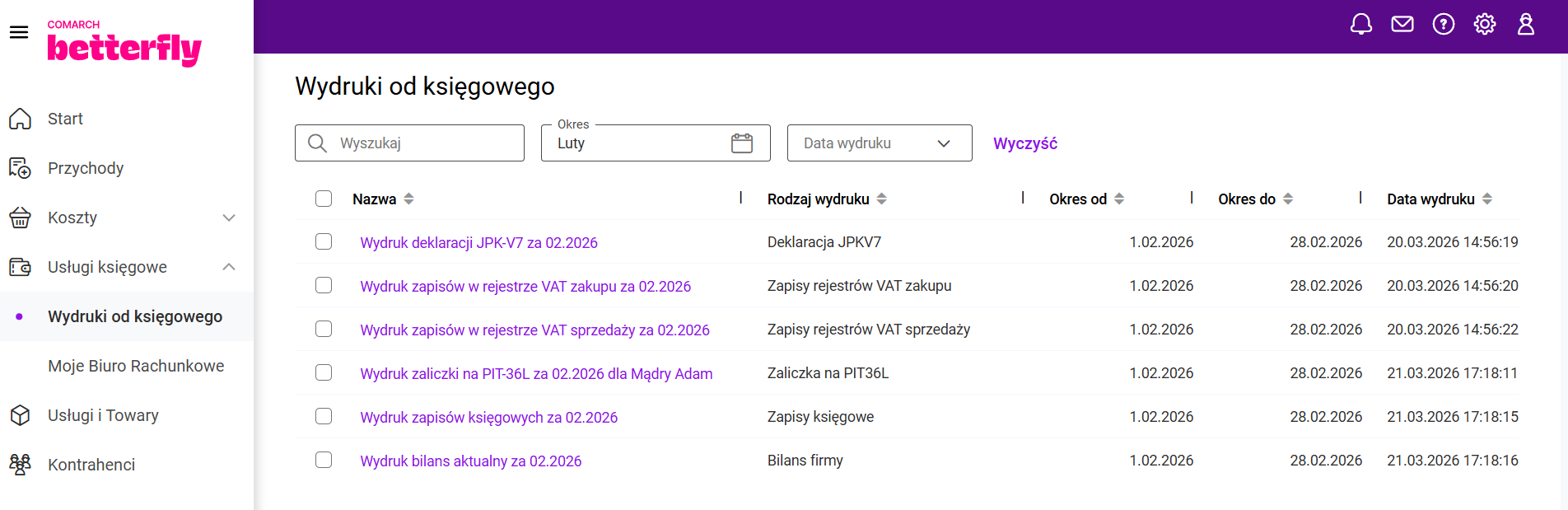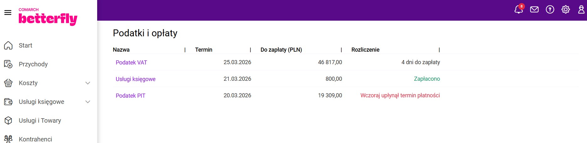 Zakres informacji obejmuje adres strony internetowej, adres e-mail oraz telefon kontaktowy. W przypadku aplikacji mobilnej z tego poziomu można od razu zadzwonić do Biura Rachunkowego lub wysłać wiadomość e-mail poprzez własną aplikację pocztową zainstalowaną na urządzeniu. W aplikacji Comarch Betterfly moduł eFaktury po uruchomieniu wymiany danych z Biurem Rachunkowym, na pulpicie startowym wyświetla się sekcja: Podatki i opłaty. Biuro Rachunkowe, po wyliczeniu odpowiednich zobowiązań Klienta, przesyła te informacje w ramach wymiany danych. Informacja o składkach ZUS Biuro Rachunkowe, z którym została nawiązana współpraca ma możliwość udostępnienia Klientom Comarch Betterfly moduł eFaktury informacji o podatkach i opłatach oraz wydruków, na podstawie których zostały wyliczone zobowiązania. Na menu głównym Usługi księgowe/ Wydruki od księgowego po odebraniu danych od Księgowego, będą dostępne wydruki dotyczące zaliczek i deklaracji, zapisów księgowych oraz rejestrów VAT. Kliknięcie w wydruk otworzy podgląd wydruku. Z tego poziomu będzie możliwe pobranie lub wydrukowanie dokumentu. Po zaznaczeniu na liście jednego, bądź kilku wydruków jest dostępna opcja Pobierz. Po jej kliknięciu zostanie pobrany plik .pdf zawierający wydruk (jeśli zaznaczony był jeden wydruk) lub plik w formacie .zip zawierający kilka wydruków (jeśli na liście zostało zaznaczonych kilka wydruków). Proces zamykania miesiąca pozwala Klientowi Biura Rachunkowego potwierdzić, że wprowadził i przekazał wszystkie wymagane dokumenty za dany miesiąc. Umożliwia to Księgowemu rozpoczęcie prac związanych z zamknięciem księgowym miesiąca i przygotowaniem deklaracji podatkowych. Zamknięcie miesiąca jest możliwe, gdy Użytkownik korzysta z Internetowej Wymiany Dokumentów. Miesiąc może być zamknięty: Funkcja Zamknięcie miesiąca może być stosowana przez Biuro Rachunkowe w dwóch trybach: Obsługa zamknięcia miesiąca Zamknięcie miesiąca przez Użytkownika jest możliwe za pomocą przycisku Zamknij miesiąc, który znajduje się na Pulpicie w sekcji z wizytówką Biura Rachunkowego. Widok sekcji Zamknięcie miesiąca gdy Biuro Rachunkowe nie przesłało terminu na zamykanie miesięcy. Widok sekcji Zamknięcie miesiąca gdy Biuro Rachunkowe przesłało termin na zamykanie miesięcy. Po kliknięciu przycisku Zamknij miesiąc pojawi się okno z komunikatem potwierdzającym chęć zamknięcia miesiąca. Gdy Użytkownik zdecyduje się zamknąć dany miesiąc program Comarch Betterfly moduł eFaktury dokona weryfikacji dokumentów. Sposób weryfikacji dokumentów będzie zależał to tego czy jest skonfigurowana integracja z Krajowym Systemem e-Faktur (KSeF). Gdy KSeF nie jest skonfigurowany program Comarch Betterfly moduł eFaktury dokona sprawdzenia czy w module Faktury znajdują się niezatwierdzone dokumenty jak poniżej: W sytuacji gdy występują dokumenty w buforze pojawi się okno z komunikatem: Po naciśnięciu przycisku Tak dokumenty zostaną automatycznie zatwierdzone. Po zatwierdzeniu dokumentów w buforze nastąpi automatyczne wysłanie dokumentów do Biura Rachunkowego przez IWD a miesiąc zostanie zamknięty. W sytuacji gdy KSeF jest skonfigurowany program Comarch Betterfly moduł eFaktury dokona dodatkowo sprawdzenia czy na liście Faktur sprzedaży znajdują się faktury, które nie zostały wysłane do KSeF. Wysłanie zaległych faktur do KSeF Użytkownik musi wykonać ręcznie. Zatwierdzenie pozostałych dokumentów, jeżeli są w buforze, może być wykonane automatycznie. Jeżeli Księgowy przesłał termin na zamykanie miesięcy i upłynie termin na zamknięcie konkretnego miesiąca: Użytkownik będzie mógł usunąć dokumenty w buforze bez potrzeby otwierania miesiąca przez Księgowego. W zamkniętym miesiącu Użytkownik nie ma możliwości dodawania nowych dokumentów ani modyfikowania niezatwierdzonych jeżeli zapis spowodowałby dodanie dokumentu do zamkniętego miesiąca. Blokada dotyczy dokumentów i wybranych na nich dat jak poniżej: Gdy na dokumencie Użytkownik wskaże datę wystawienia (dla dokumentów sprzedażowych) lub datę wpływu (dla dokumentów kosztowych), która zawiera się w zamkniętym okresie pojawi się komunikat informujący o zamknięciu miesiąca. Gdy dany miesiąc został zamknięty wysyłka dokumentów za dany okres do Biura Rachunkowego przez IWD nie jest możliwa. Jeżeli zakres dat, wybrany na oknie Dodatkowa wymiana danych, obejmuje, nawet częściowo, przynajmniej jeden zamknięty miesiąc zostanie wyświetlona informacja jak poniżej: Zamknięty miesiąc może otworzyć tylko Księgowy. W związku z tym aby otworzyć zamknięty miesiąc należy skontaktować się z Księgowym. Można wykorzystać w tym celu panel wiadomości. Więcej informacji na ten temat znajduje się w artykule: Gdzie można wysłać wiadomość do Biura Rachunkowego? Po przesłaniu przez Biuro Rachunkowe przez IWD informacji o otwarciu miesiąca dany miesiąc zostanie otwarty, w Centrum powiadomień pojawi się informacja o tym fakcie, a na Pulpicie w sekcji „Zamknięcie miesiąca” będzie aktywny przycisk Zamknij miesiąc. W Centrum powiadomień Użytkownik może znaleźć poniższe informacje o zamknięciu miesiąca. Przypisanie kategorii sprzedaży/zakupu do kontrahenta przyspiesza opisywanie dokumentów dla Biura rachunkowego, ponieważ jest ona automatycznie przenoszona na wprowadzane dokumenty. Użytkownik ma możliwość seryjnego przypisywania kategorii sprzedaży oraz zakupu dla wielu kontrahentów jednocześnie. Na liście Kontrahenci, po zaznaczeniu jednego lub więcej kontrahentów, w menu kontekstowym dostępne są opcje Zmień kategorię sprzedaży oraz Zmień kategorię zakupu. Wybierając opcję Zmień kategorię sprzedaży, Użytkownik może przypisać nową kategorię sprzedaży dla wybranych kontrahentów. Analogicznie, opcja Zmień kategorię zakupu umożliwia przypisanie nowej kategorii zaku