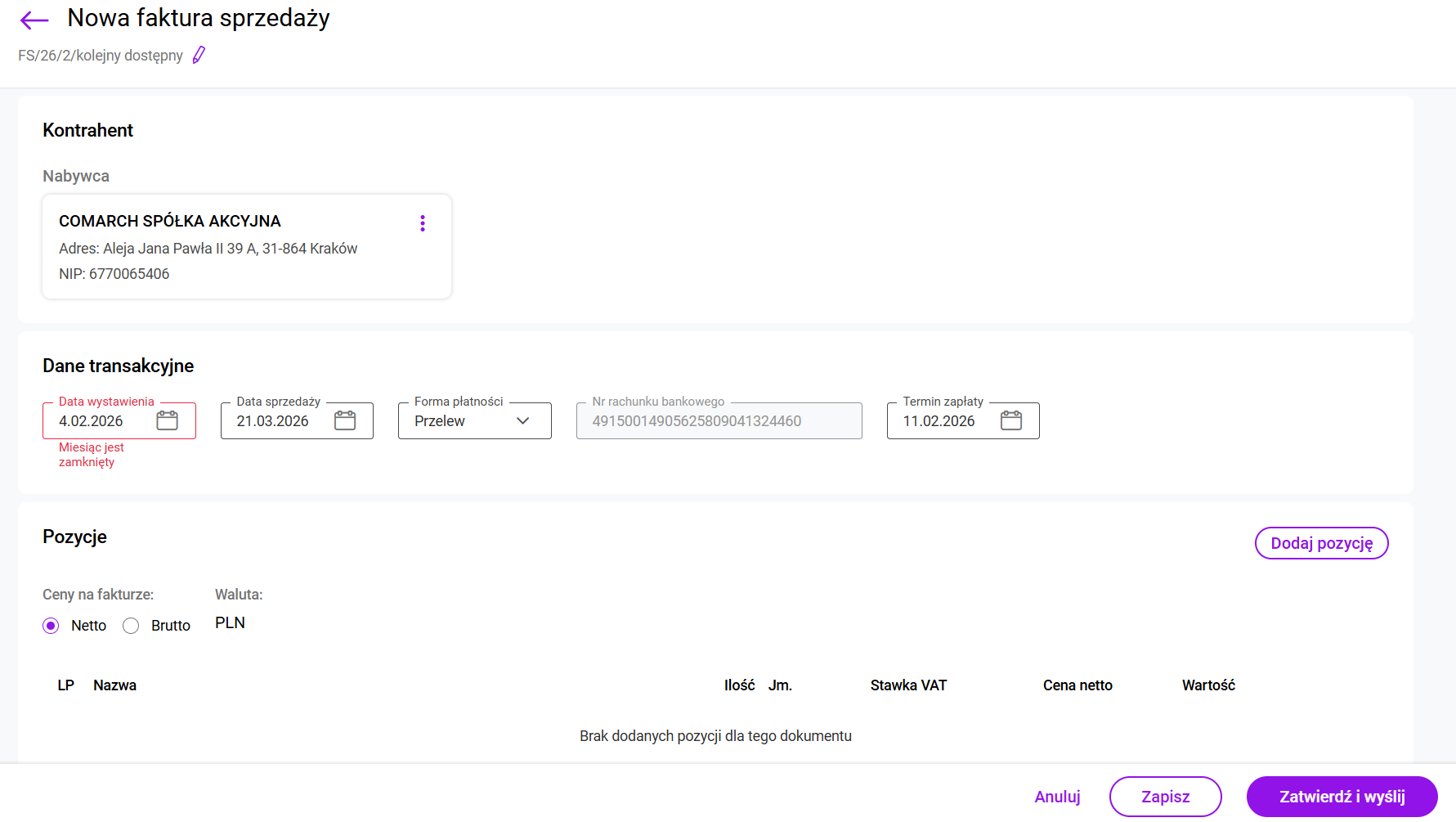 - Jeśli zaimportowany zostanie jeden dokument, kliknięcie przycisku Dalej otworzy formularz pojedynczej faktury.