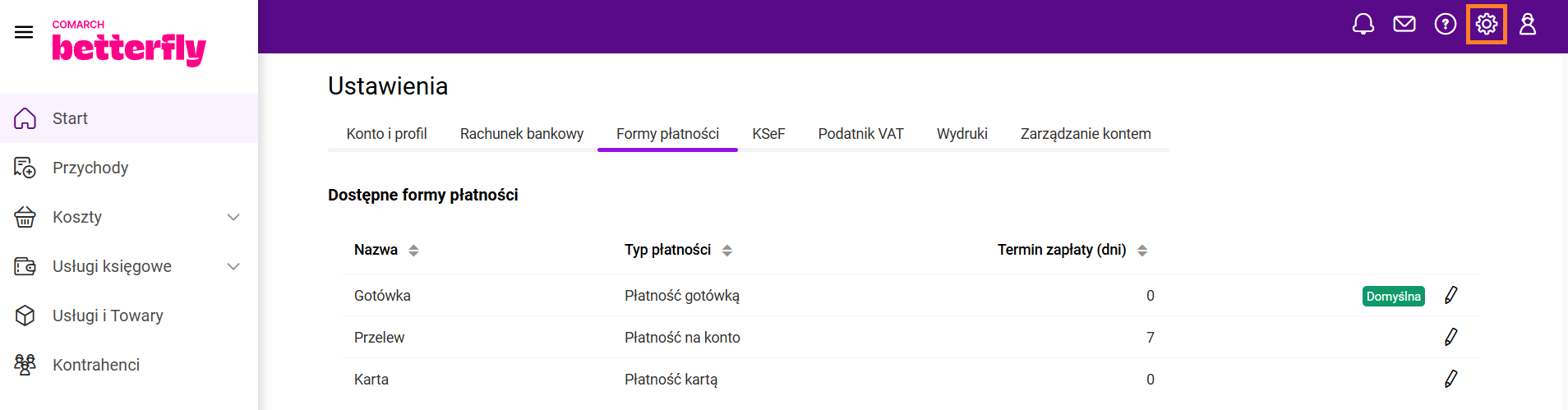 Jak zmienić domyślną formę płatności?Jak usunąć konto w Comarch Betterfly moduł eFaktury?