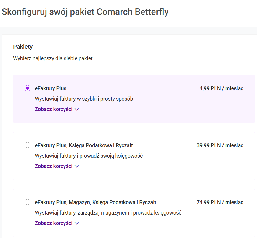 Lista faktur sprzedaży dostępna jest w menu Przychody. Aby dodać nowy dokument, należy wybrać opcję Wystaw fakturę. Otworzy się wówczas formularz nowej faktury sprzedaży. Należy uzupełnić kontrahenta oraz dodać pozycje faktury. W razie potrzeby można zmienić numer dokumentu ikoną ołówka, która znajduje się na górnym pasku formularza. Po kliknięciu w opcję: Wybierz kontrahenta wyświetla się lista kontrahentów, z której można wybrać właściwego. Jeśli kontrahenta nie widać na liście, można wyszukać go wpisując nazwę w polu wyszukiwania. Jeśli w programie nie będzie istniał taki kontrahent, można też dodać jego kartę klikając na ikonę z plusem (Dodaj nowego kontrahenta). Podobnie należy postąpić, aby dodać produkty na fakturę. Po kliknięciu na: Dodaj pozycję” zostanie wyświetlona lista produktów. Można wybrać produkt z listy oraz skorzystać z wyszukiwarki. Dzięki opcji: Dodaj pozycję ręcznie można wprowadzić pozycje, których nie ma na liście produktów oraz zdecydować: Na fakturze sprzedaży można też ustalić datę dokumentu i formę zapłaty, wybrać sposób przeliczania faktury od cen netto lub brutto oraz podać dodatkowe informacje w polu Opis. Istnieje także możliwość przejścia na pakiet eFaktury Plus, który daje możliwość wystawiania nielimitowanej ilości dokumentów w programie Comarch Betterfly. W tym pakiecie nie ma możliwości importowania faktur sprzedaży z KSeF. W aplikacji Comarch Betterfly pakiet eFaktury Plus jest możliwa wymiana danych z Krajowym Systemem e-Faktur (KSeF). Aby rozpocząć wymianę danych z KSeF należy zintegrować Comarch Betterfly moduł z Krajowym Systemem e-Faktur. Więcej informacji na ten temat znajduje się w artykule: Jak skonfigurować integrację z Krajowym Systemem e-Faktur (KSeF) Do Krajowego Systemu e-Faktur (KSeF) można wysłać dokumenty typu: faktury sprzedaży, faktury zaliczkowe i finalne do zaliczkowych, faktury VAT marża oraz ich korekty. Wysłanie następuje w momencie zatwierdzenia dokumentu lub na życzenie (jeżeli użytkownik na roli ma odznaczony parametr Automatyczne wysyłanie faktur do KSeF przy zatwierdzaniu dokumentów). Proces jest całkowicie automatyczny i składa się z kilku etapów: Status dokumentu w KSeF oraz jego numer referencyjny i numer KSeF można sprawdzić na formularzu dokumentu, na zakładce KSeF. Po zalogowaniu na konto w aplikacji dostępne jest Centrum powiadomień. W Centrum zbierane są powiadomienia dotyczące m.in. wysyłania dokumentów do KSeF w sytuacji gdy wysyłka się nie powiedzie. Po rozwinięciu szczegółów można sprawdzić, jak zakończył się proces, a po kliknięciu w konkretne powiadomienie – otworzyć formularz faktury i sprawdzić szczegóły: W przypadku, jeśli dokument z jakiegoś powodu zostanie odrzucony w KSeF, otrzymuje status Nie wysłano do KSeF. Oznacza to, że dokument nie został przyjęty w KSeF. W takiej sytuacji możliwa jest jego ponowna wysyłka bądź można taki dokument anulować. Obie opcje dostępne są z poziomu formularza dokumentu: W przypadku, gdy nie uda się pobrać UPO dla dokumentu, otrzyma on status Nie udało się pobrać UPO. Na takim dokumencie dostępny będzie przycisk Wyślij, który wznowi proces na przerwanym etapie, czyli dobierze UPO i wyśle dokument do Biura Rachunkowego. Anulowanie dokumentu jest równoznaczne z jego wycofaniem. Zwalniany jest numer dokumentu i można wystawić kolejny poprawny dokument z tym samym numerem.