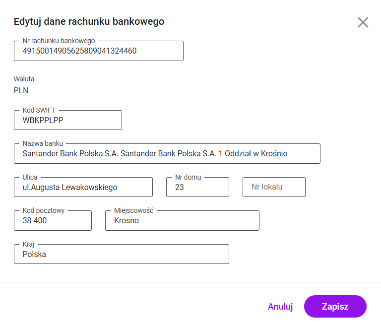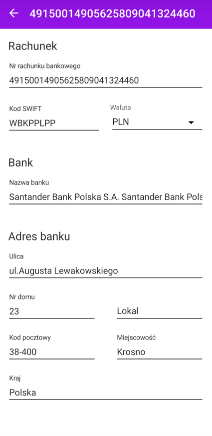 Po podaniu numeru rachunku, automatycznie uzupełniane są nazwa banku i dane teleadresowe. Można je jednak dowolnie edytować i zmieniać.