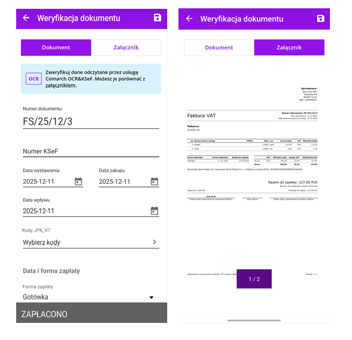 Aby szybko zweryfikować fakturę dodawaną za pomocą aplikacji mobilnej, należy skorzystać z dostępnej zakładki Załącznik, na której widoczna jest odczytana faktura.