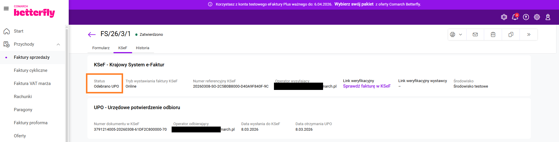 Istnieje także możliwość przejścia na pakiet eFaktury Plus, który daje możliwość wystawiania nielimitowanej ilości dokumentów w programie Comarch Betterfly. W tym pakiecie nie ma możliwości importowania faktur sprzedaży z KSeF. W aplikacji Comarch Betterfly pakiet eFaktury Plus jest możliwa wymiana danych z Krajowym Systemem e-Faktur (KSeF). Aby rozpocząć wymianę danych z KSeF należy zintegrować Comarch Betterfly moduł z Krajowym Systemem e-Faktur. Więcej informacji na ten temat znajduje się w artykule: Jak skonfigurować integrację z Krajowym Systemem e-Faktur (KSeF) Do Krajowego Systemu e-Faktur (KSeF) można wysłać dokumenty typu: faktury sprzedaży, faktury zaliczkowe i finalne do zaliczkowych, faktury VAT marża oraz ich korekty. Wysłanie następuje w momencie zatwierdzenia dokumentu lub na życzenie (jeżeli użytkownik na roli ma odznaczony parametr Automatyczne wysyłanie faktur do KSeF przy zatwierdzaniu dokumentów). Proces jest całkowicie automatyczny i składa się z kilku etapów: Status dokumentu w KSeF oraz jego numer referencyjny i numer KSeF można sprawdzić na formularzu dokumentu, na zakładce KSeF. Po zalogowaniu na konto w aplikacji dostępne jest Centrum powiadomień. W Centrum zbierane są powiadomienia dotyczące m.in. wysyłania dokumentów do KSeF w sytuacji gdy wysyłka się nie powiedzie. Po rozwinięciu szczegółów można sprawdzić, jak zakończył się proces, a po kliknięciu w konkretne powiadomienie – otworzyć formularz faktury i sprawdzić szczegóły: W przypadku, jeśli dokument z jakiegoś powodu zostanie odrzucony w KSeF, otrzymuje status Nie wysłano do KSeF. Oznacza to, że dokument nie został przyjęty w KSeF. W takiej sytuacji możliwa jest jego ponowna wysyłka bądź można taki dokument anulować. Obie opcje dostępne są z poziomu formularza dokumentu: W przypadku, gdy nie uda się pobrać UPO dla dokumentu, otrzyma on status Nie udało się pobrać UPO. Na takim dokumencie dostępny będzie przycisk Wyślij, który wznowi proces na przerwanym etapie, czyli dobierze UPO i wyśle dokument do Biura Rachunkowego. Anulowanie dokumentu jest równoznaczne z jego wycofaniem. Zwalniany jest numer dokumentu i można wystawić kolejny poprawny dokument z tym samym numerem.