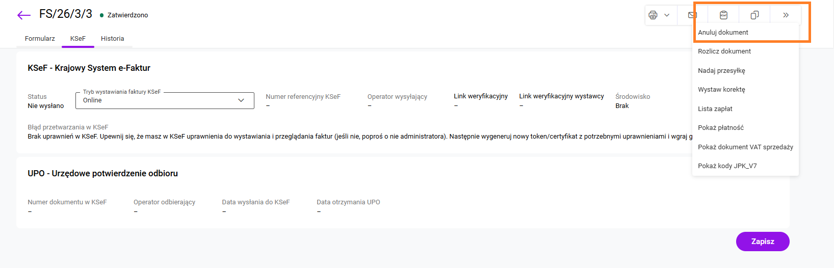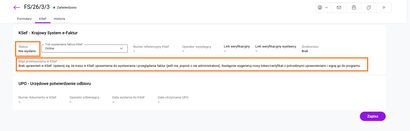 Jeżeli wysyłka się nie powiedzie, na zakładce KSeF będzie dostępna informacja o powodzie.