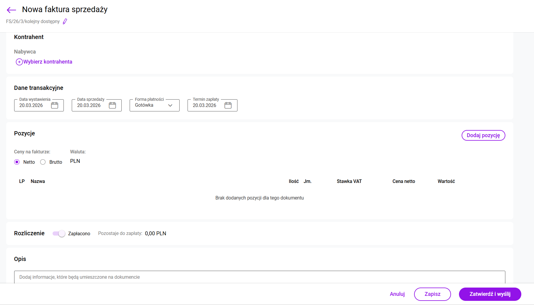 Na fakturze sprzedaży można też ustalić datę dokumentu i formę zapłaty, wybrać sposób przeliczania faktury od cen netto lub brutto oraz podać dodatkowe informacje w polu Opis.