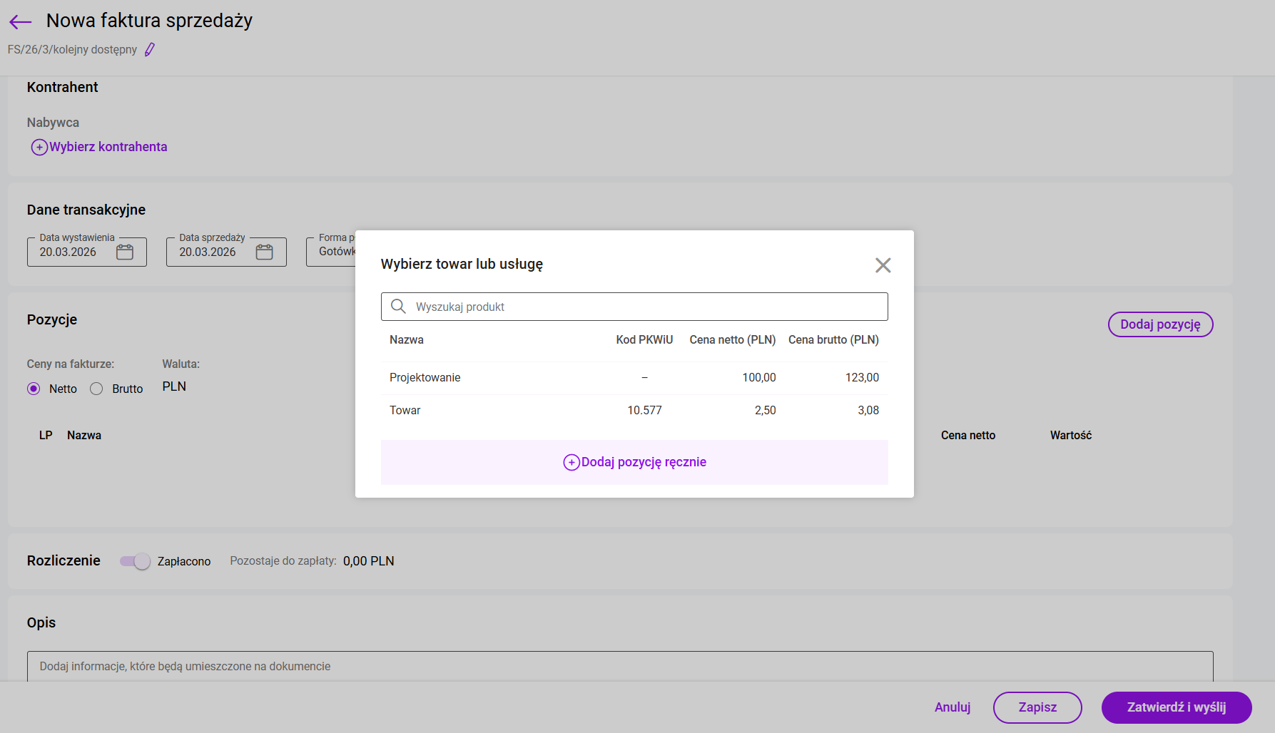 Dzięki opcji: Dodaj pozycję ręcznie można wprowadzić pozycje, których nie ma na liście produktów oraz zdecydować: