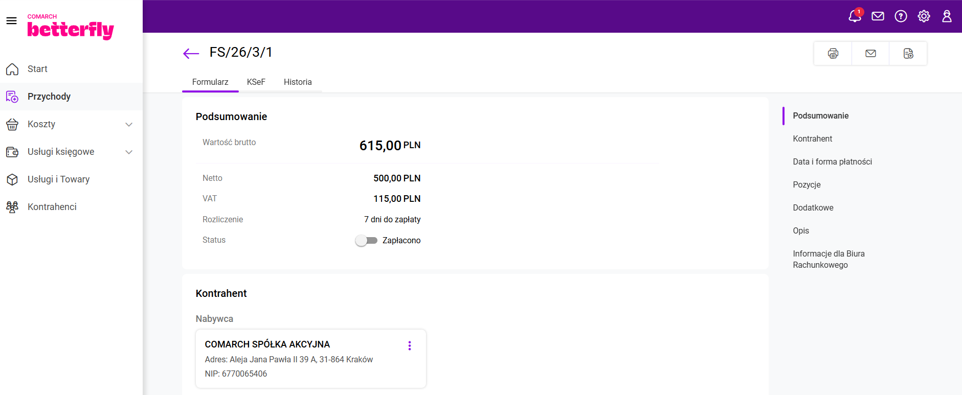 W sekcji Dodatkowe można wybrać domyślną formę płatności kontrahenta, która będzie się automatycznie ustawiać na wystawianych dla niego dokumentach oraz przypisać domyślne kody JPK_V7. Karty istniejących kontrahentów można w każdej chwili edytować, aby wprowadzać potrzebne modyfikacje. Zmiana numeru dokumentu na fakturach sprzedaży (oraz korektach) jest możliwa podczas wystawiania nowego dokumentu oraz na dokumentach zapisanych ''do bufora''. Aby zmienić numer należy na formularzu w polu, gdzie jest numer dokumentu, kliknąć w ikonę ołówka. Biuro rachunkowe, z którym została nawiązana współpraca, może udostępnić klientom Comarch Betterfly moduł eFaktury i możliwość dodawania dokumentów sprzedaży na podstawie skanów. Funkcja jest dostępna dla biur rachunkowych od wersji Comarch ERP Optima 2025.0. Po udostępnieniu tej opcji przez biuro rachunkowe za pomocą Internetowej Wymiany Dokumentów (IWD), w menu Przychody pojawi się lista Sprzedaż. Wprowadzanie dokumentów sprzedaży na podstawie skanów jest możliwe zarówno poprzez stronę internetową Comarch Betterfly moduł eFaktury, jak i za pomocą aplikacji mobilnych dostępnych na system Android oraz iOS. Dokument sprzedaży na podstawie skanu można wprowadzić: Każdy dokument jest automatycznie przetwarzany przez usługę Comarch OCR&KSeF. Aplikacja pozwala na dodanie plików w formatach .jpg, .pdf lub .png, o maksymalnym rozmiarze 2 MB. W aplikacji mobilnej dodatkowo możliwe jest dodanie dokumentu za pomocą zdjęcia – wówczas uruchomi się aparat, a aplikacja podświetli proponowany obszar dokumentu na kolor niebieski. Po wykonaniu zdjęcia lub wybraniu pliku w aplikacji mobilnej, dostępna jest opcja edycji: zmiana kolorów, odwrócenie obrazu czy przycięcie obszaru dokumentu. Po zakończeniu edycji można przejść do kolejnego kroku. Podczas odczytu dokumentu przez OCR&KSeF, rozpoznawane są następujące dane: Jeżeli OCR&KSeF rozpozna dane kontrahenta, który nie znajduje się jeszcze w bazie, istnieje możliwość zapisania jego karty. W przypadku różnicy między zapisanymi danymi a nowymi, użytkownik ma możliwość ich aktualizacji lub wyboru innego kontrahenta. Po odczytaniu dokumentu przez Comarch OCR&KSeF przez aplikację przeglądarkową plik zostanie zwizualizowany w oknie po lewej stronie ekranu – po prawej stronie zostaną wyświetlone odczytane dane, które można w razie potrzeby skorygować. Aby szybko zweryfikować dokument w aplikacji mobilnej, można skorzystać z zakładki Załącznik, gdzie wyświetlona jest odczytana faktura. Na dokumentach sprzedaży można również ustawić odpowiednie kody JPK_V7 dla transakcji, co jest niezbędne do prawidłowego sporządzenia deklaracji VAT w biurze rachunkowym (JPK_V7M lub JPK_V7K). W sekcji Informacje dla Biura Rachunkowego użytkownik może wybrać kategorię sprzedaży oraz dodać dodatkowe informacje dla księgowego. Aby zatwierdzić odczytane dane, należy kliknąć przycisk Wyślij do Biura Rachunkowego. Po przesłaniu dokumentu, będzie on dostępny do odczytu, a załącznik można podejrzeć w każdej chwili. Kliknięcie na przycisk Anuluj nie zapisze wprowadzonych przez użytkownika zmian na formularzu – na liście będzie widoczny zeskanowany dokument z danymi jakie zostały automatycznie odczytane. Na liście Sprzedaż są dostępne następujące operacje seryjne: Opcje Wyślij do Biura Rachunkowego, Zmień kategorię sprzedaży oraz Zmień opis są dostępne, jeśli: Na liście Sprzedaż, po zaznaczeniu wybranych dokumentów, w menu kontekstowym widoczna jest opcja Zmień kategorię sprzedaży. Po jej wybraniu wyświetli się okno, w którym można wybrać nową kategorię sprzedaży. Jeśli na zaznaczonych dokumentach była przypisana inna kategoria, zostanie ona zmieniona na nową. Na liście Sprzedaż po zaznaczeniu wybranych dokumentów, dostępna jest opcja Zmień opis. Po jej wyborze wyświetli się okno, w którym można wprowadzić Opis dla Księgowego. Na liście Sprzedaż, po zaznaczeniu dokumentów sprzedaży dodanych przez OCR&KSeF, dostępna jest opcja Wyślij do Biura Rachunkowego. Jeśli wśród zaznaczonych faktur znajduje się dokument, który już został wysłany zostanie wyświetlony komunikat jak poniżej: Po wybraniu opcji Tak, wyślij nastąpi weryfikacja konfiguracji Internetowej Wymiany Dokumentów (IWD). Jeśli IWD jest poprawnie skonfigurowane, zostanie wyświetlone okno z potwierdzeniem wysyłki dokumentów: Po zakończeniu przesyłania pojawi się poniższy toast: Każdy użytkownik ma możliwość bezpłatnego przesłania do 20 stron miesięcznie. Jeśli potrzebna jest większa ilość, można rozszerzyć ilość stron lub wykupić abonament w sklepie Comarch. Więcej informacji na temat wystawiania faktur sprzedaży bezpośrednio w programie Comarch Betterfly moduł eFaktury można znaleźć w artykule: Jak wystawić fakturę sprzedaży w module eFaktury? W przypadku problemów technicznych po stronie rządowej lub własnej infrastruktury, system Betterfly umożliwia zachowanie ciągłości sprzedaży poprzez obsługę trzech trybów niedostępności: Offline, Offline24 oraz Awaria KSeF. Oto jak przebiega proces wystawiania dokumentów w sytuacjach awaryjnych: Wybór trybu na dokumencie: Podczas wystawiania faktury w warunkach braku łączności, użytkownik musi na konkretnym dokumencie ręcznie wskazać odpowiedni tryb pracy: Offline24, Offline lub Awaria KSeF. Zatwierdzanie dokumentu: Program pozwala na zatwierdzenie faktury, mimo braku połączenia z bramką ministerialną. Dokumenty te nie są wysyłane automatycznie; użytkownik musi zainicjować ich przesłanie ręcznie po przywróceniu sprawności systemu KSeF. Księgowanie i JPK: Dokumenty wystawione w trybach niedostępności trafiają bezpośrednio do rejestrów VAT. Są one oznaczane specjalnymi kodami JPK, co zapewnia poprawność wyliczeń deklaracji JPK_V7 nawet bez nadanego numeru KSeF. Wydruk faktury: Je