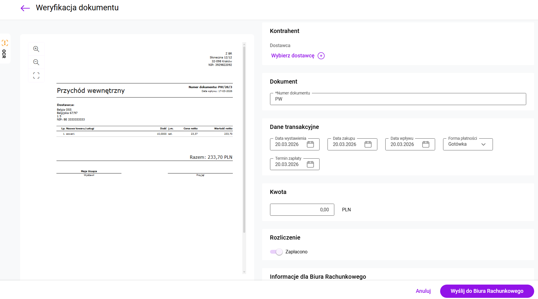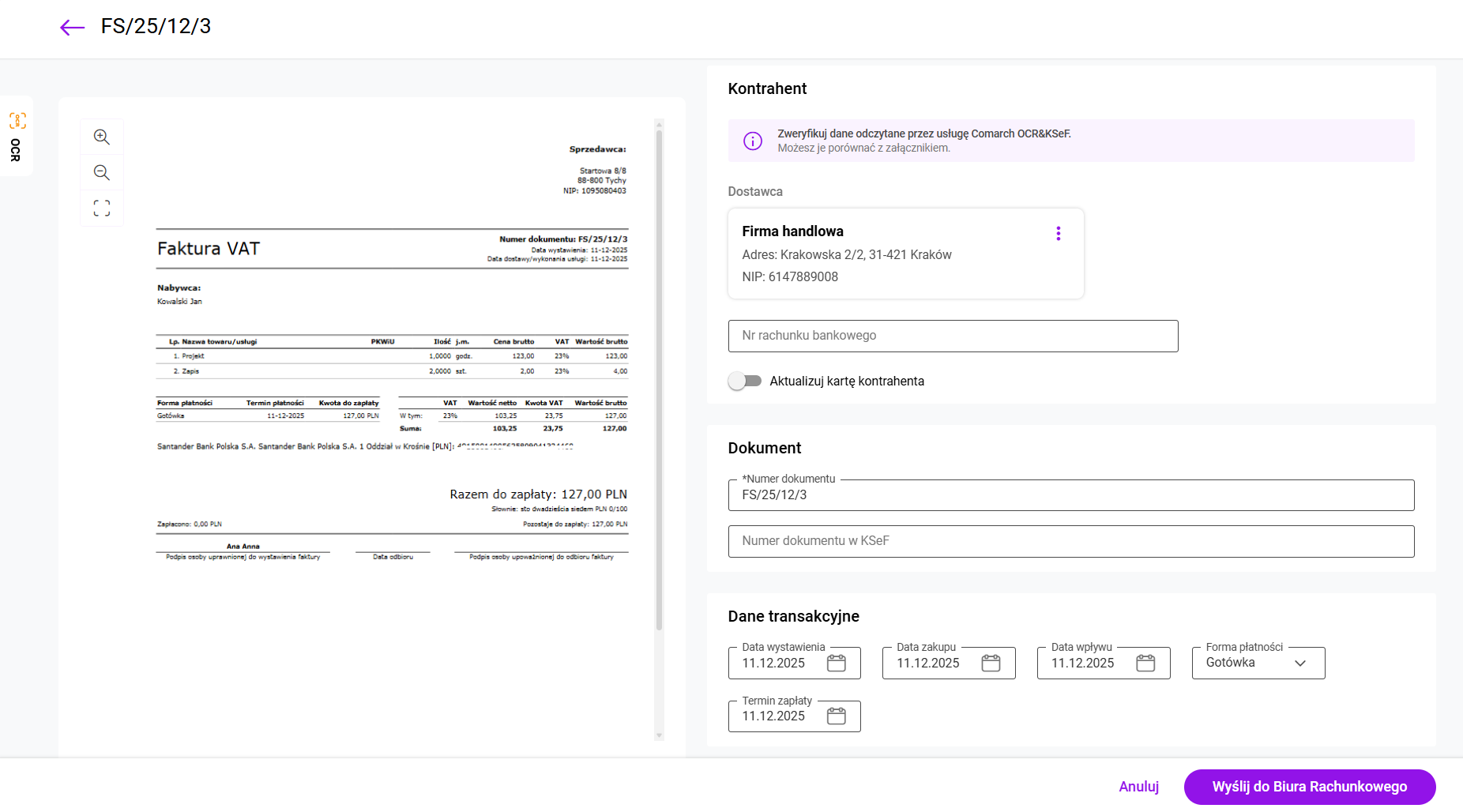 Przyciskiem Wyślij do Biura Rachunkowego należy zatwierdzić odczytane dane. Dokument po przesłaniu do Biura Rachunkowego będzie dostępny w trybie do odczytu. W każdej chwili będzie można także podejrzeć załącznik.