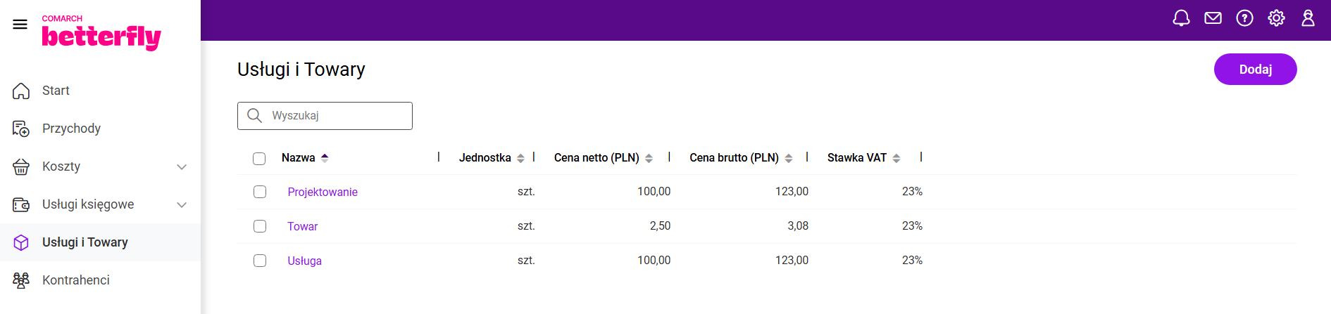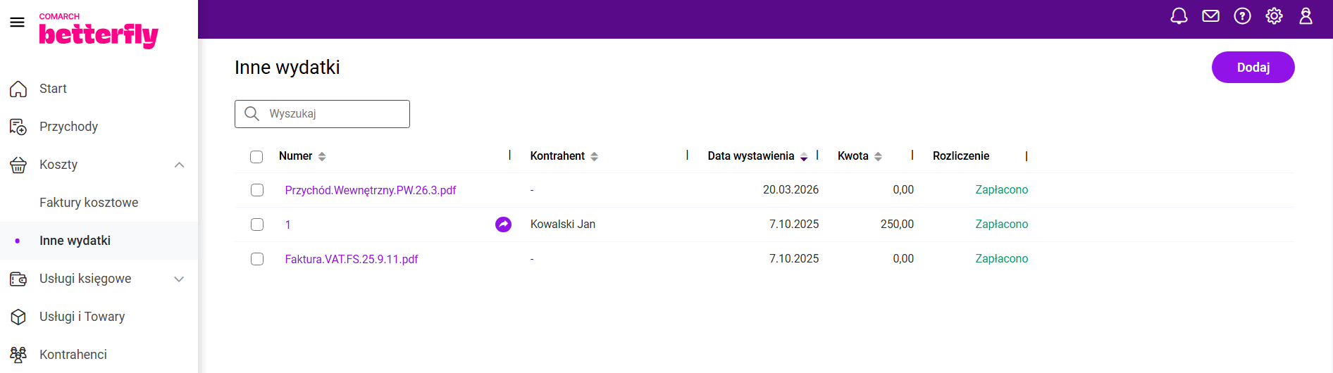 Zarówno na karcie produktu, jak i kontrahenta, można zdefiniować domyślne kody JPK_V7. W ten sposób przypisane kody będą automatycznie przenoszone na transakcje, jeśli pojawi się na nich dany produkt lub zostanie wskazany kontrahent: Na przykład jeśli dany kontrahent to tzw. rolnik ryczałtowy, warto na jego karcie wprowadzić kod VAT_RR. Wtedy automatycznie wszystkie rejestrowane dla niego faktury zakupu zostaną automatycznie oznaczone takim kodem. Jak dodać i edytować dane kontrahenta? Wprowadzanie dokumentów jako inny wydatek jest możliwe poprzez stronę internetową Comarch Betterfly moduł eFaktury. Lista: Inne wydatki służy do dodawania dokumentów, które nie są dokumentami VAT oraz Użytkownik chciałby prowadzić ich osobną ewidencję. Jest możliwość również wysyłki takich dokumentów do Biura Rachunkowego za pomocą IWD podobnie jak obecnie jest to możliwe dla faktur sprzedaży oraz zakupu. Dodawanie innego wydatku dostępne jest na liście Inne wydatki. Klikając odpowiednio w opcję: Dodaj można wczytać nowy dokument z pliku. Do dodawania dokumentów jest wykorzystywana usługa Comarch OCR&KSeF na zasadzie skanera dla dokumentów. Aplikacja pozwala na dodanie plików w formacie .jpg, .pdf lub .png o maksymalnym rozmiarze 2 MB. Podczas uzupełniania dokumentu należy samodzielnie wskazać: Przy dodawaniu innego wydatku poprzez aplikację przeglądarkową Comarch Betterfly moduł eFaktury jest widoczny podgląd dokumentu wraz z polami do uzupełnienia danych. Ułatwia to naniesienie niezbędnych informacji. Wprowadzony dokument można wysłać do Biura Rachunkowego przyciskiem: Wyślij do Biura Rachunkowego. Dokument po przesłaniu do Biura Rachunkowego będzie dostępny w trybie do odczytu. W każdej chwili będzie można także podejrzeć załącznik. Z listy Inne wydatki istnieje możliwość usunięcia danego zapisu dokumentu, niezależnie czy został on przesłany do Biura Rachunkowego czy też pozostaje w edycji. Pozycje zliczane są według daty wprowadzenia ich do systemu i według wykorzystywanych stron w usłudze Comarch OCR&KSeF. Użytkownik w każdym miesiącu ma do wykorzystania bezpłatnie 20 stron. W razie potrzeby może rozszerzyć ilość stron lub wykupić abonament poprzez sklep Comarch. Przypisanie kategorii sprzedaży/zakupu do kontrahenta przyspiesza opisywanie dokumentów dla Biura rachunkowego, ponieważ jest ona automatycznie przenoszona na wprowadzane dokumenty. Użytkownik ma możliwość seryjnego przypisywania kategorii sprzedaży oraz zakupu dla wielu kontrahentów jednocześnie. Na liście Kontrahenci, po zaznaczeniu jednego lub więcej kontrahentów, w menu kontekstowym dostępne są opcje Zmień kategorię sprzedaży oraz Zmień kategorię zakupu. Wybierając opcję Zmień kategorię sprzedaży, Użytkownik może przypisać nową kategorię sprzedaży dla wybranych kontrahentów. Analogicznie, opcja Zmień kategorię zakupu umożliwia przypisanie nowej kategorii zakupu. Jeśli żaden z zaznaczonych kontrahentów nie ma przypisanej kategorii, wybrana kategoria zostanie ustawiona dla wszystkich zaznaczonych kontrahentów. W przypadku, gdy któryś z kontrahentów miał już przypisaną kategorię, zostanie ona zastąpiona nową. Na liście Kontrahenci przypisane kategorie są widoczne w kolumnach: Kategoria sprzedaży i Kategoria zakupu.
