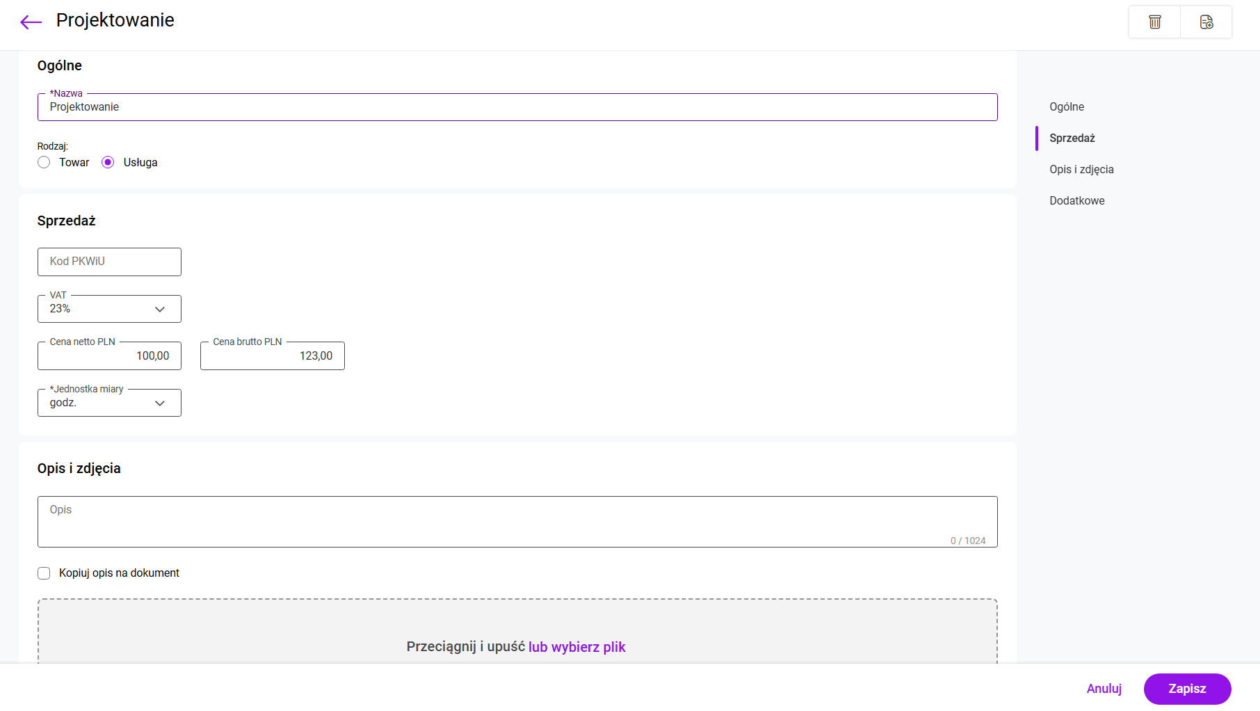 Otworzy się wówczas formularz nowego produktu. Należy na nim określić czy produkt jest towarem czy usługą oraz uzupełnić dane o produkcie: nazwę, cenę, stawkę VAT, jednostkę miary. Jest też możliwość dodania kodu JPK_V7, opisu czy zdjęcia produktu.